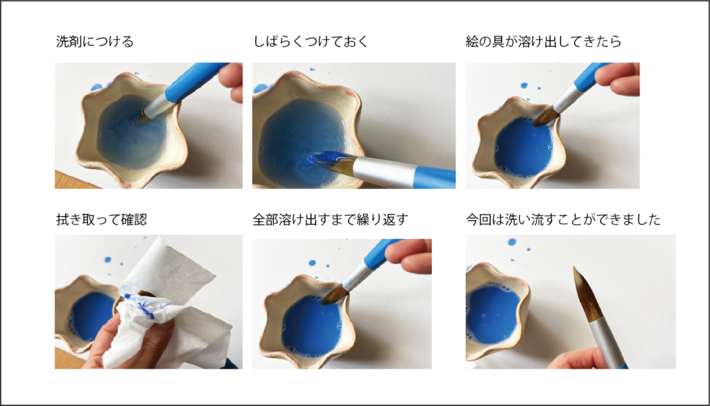 1.描いたらすぐに絵の具を拭きとる 2.筆洗で洗う3.石鹸で洗浄後、筆は下向きで乾燥させる