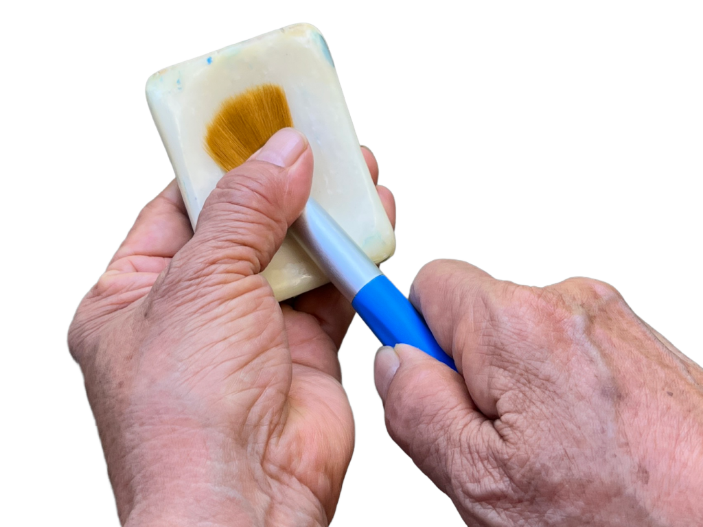2.絵の具をふやかして柔らかくなったら、毛をやさしく揉みほぐす