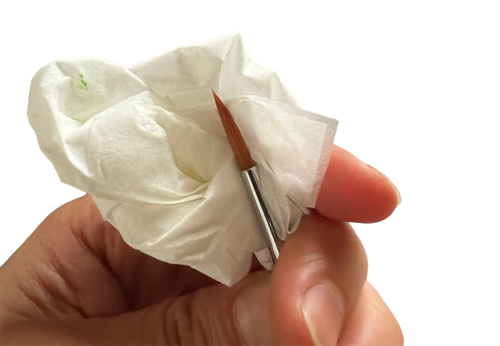 筆洗で洗ったら、再度、ティッシュなどで水分を拭き取ります。