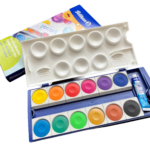 どちらも各色、長方形のパレットに固められて箱に入っています。どちらもフタを開けるとすぐに描き出すことができます。描き終えた後は、フタは開けたままにして乾燥させてください。